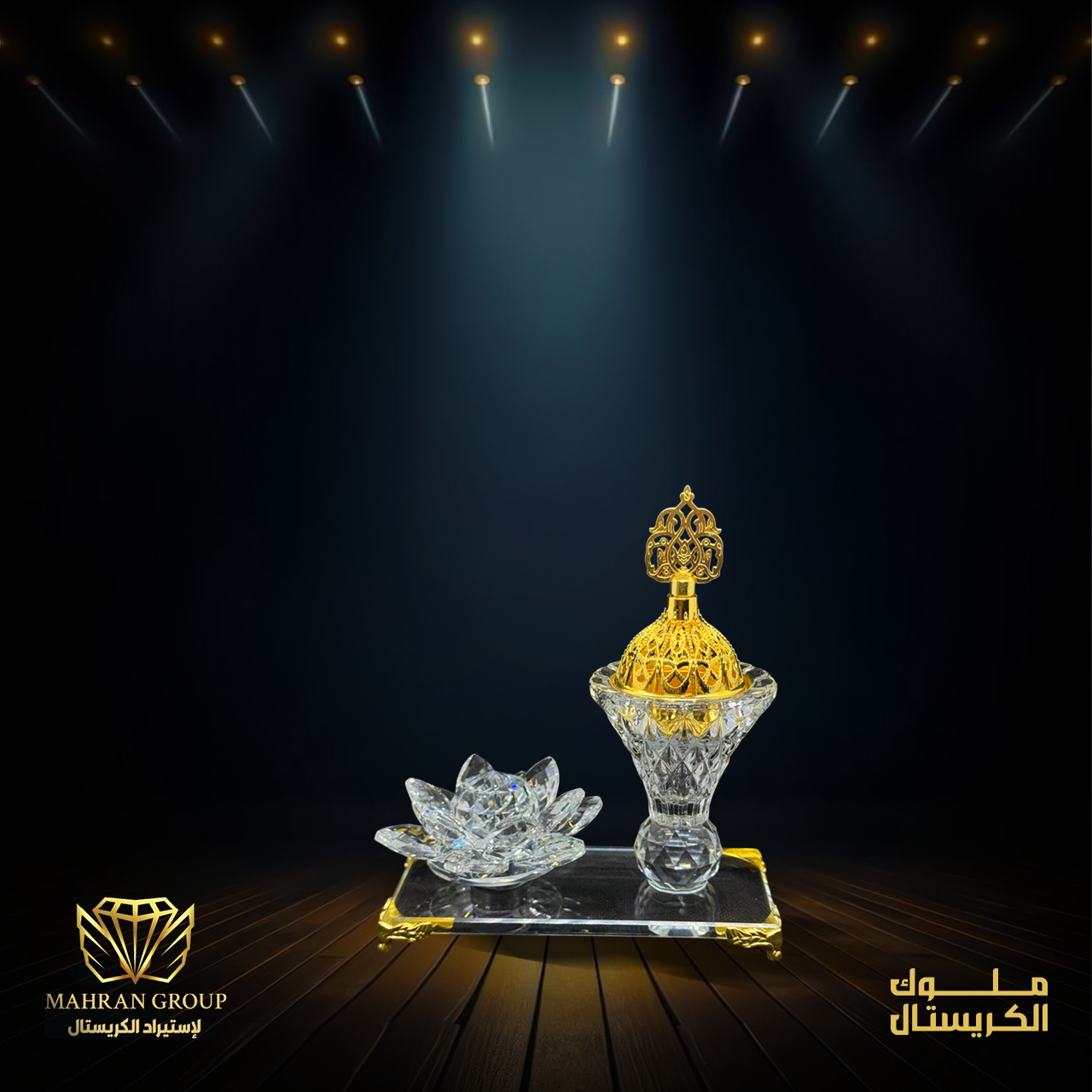 مبخرة مصنوعة من الكريستال الفاخر علي قاعدة كريستال بجوارها خرشوفة مصنوعة من الكريستال