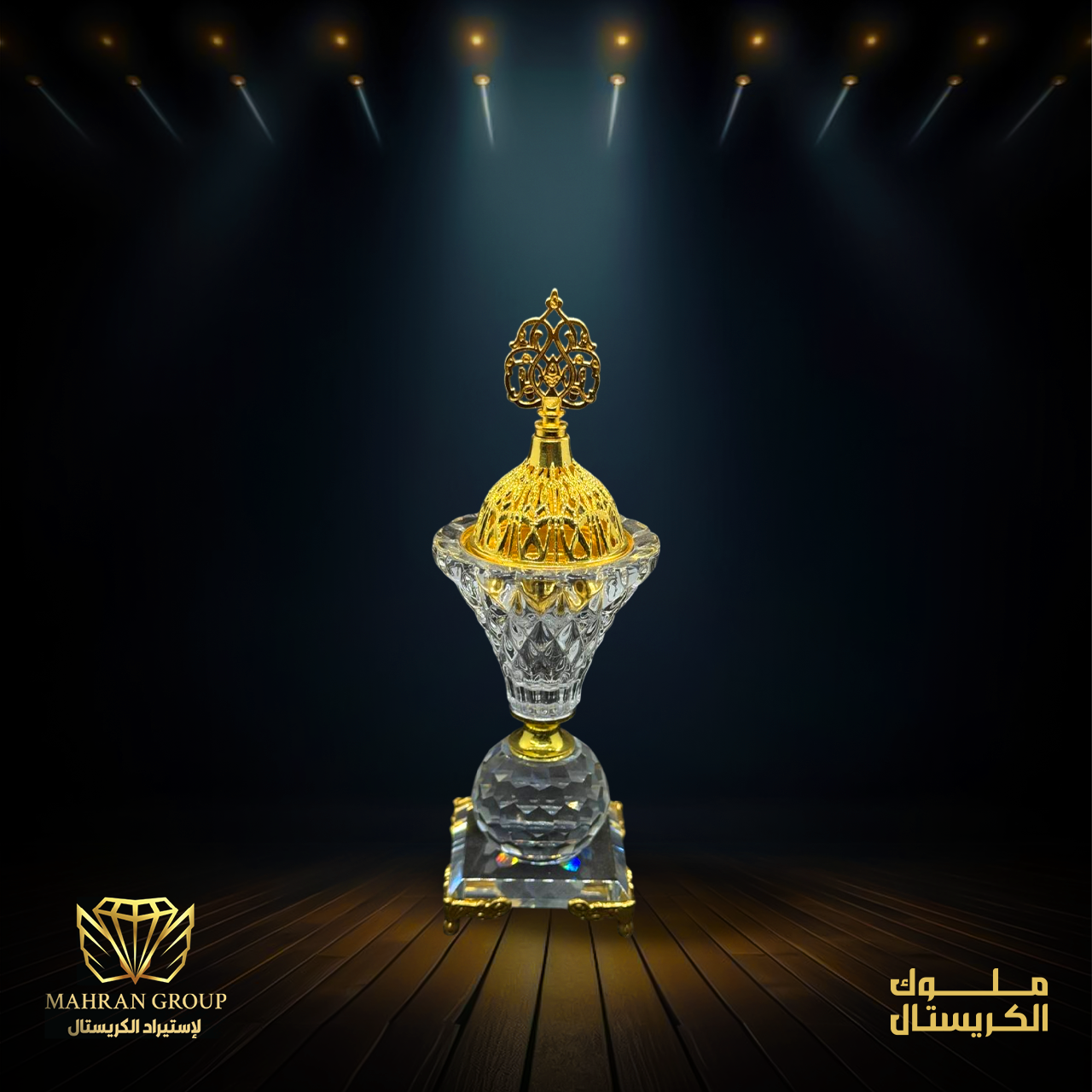 مبخرة مصنوعة من الكريستال الفاخر يتوسطها كريستال كروي وبها 4 رجل من النحاس